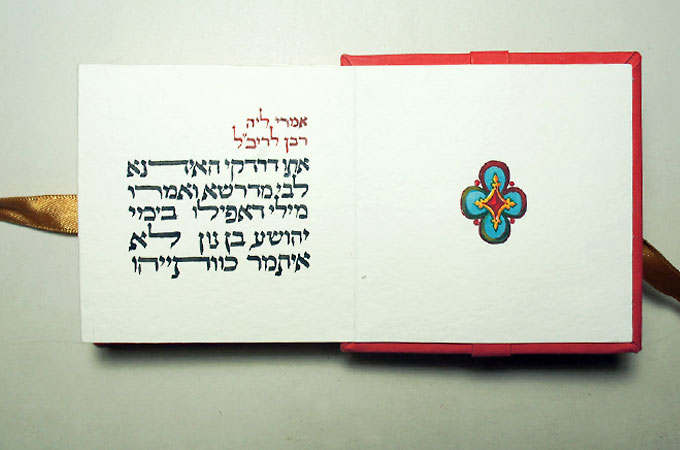 One copy hand-made book. Text: Talmud Babli, Shabat, 104, 1. Paper, ink, gouache, 7,5 x 7,5 cm. 2012